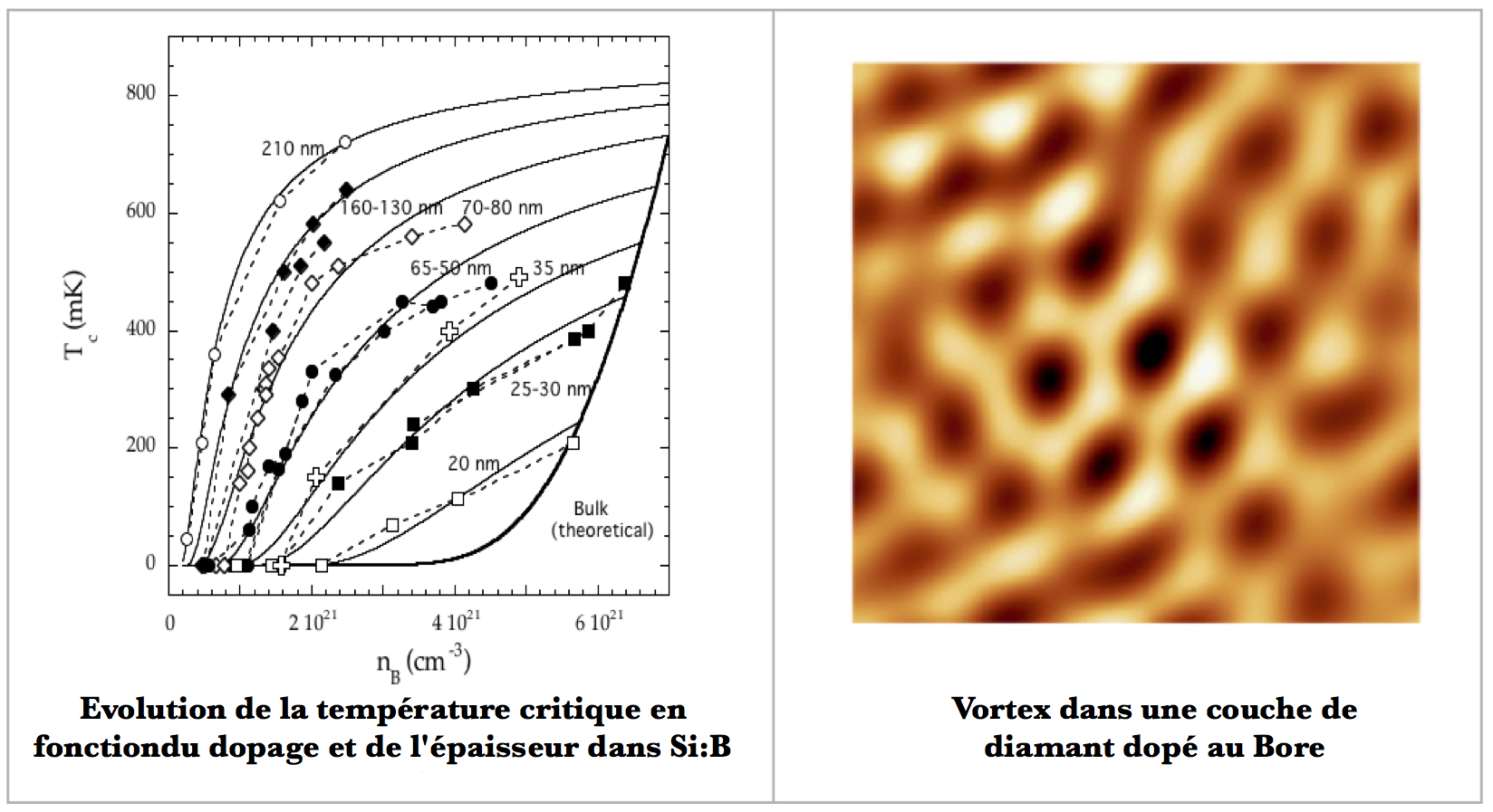 Le formidable regain d'intérêt pour la supraconductivité qui suivi la découverte des cuprates permit également de découvrir de nouveaux systèmes aux propriétés étonnantes. MgB2 tout d'abord (découvert en 2001) dans lequel deux bandes supraconductrices coexistent (et Tc ∼ 40K !) puis les supraconducteurs covalents obtenus par dopage de composés isolants (voir par exemple notre article dans reflets de la physique (CNRS, 2013) ou Nature Materials, 8, 275 (2009)). Archetype des isolants, le diamant (dopé au Bore) constituent également une plateforme particulièrement intéressante pour l'étude de la transition isolant-supraconducteur.