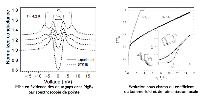 La découverte en 2001 d'une température critique anormalement élevée (~ 39 K) dans un supraconducteur "conventionnel" a une fois de plus, relancé l'intérêt pour l'étude de la supraconductivité. Néanmoins il est rapidement apparu que la particularité la plus intéressante de MgB2 n'était pas sa température critique anormalement élevée mais le fait que deux bandes distinctes (liées aux orbitales σ et π du bore) pouvaient donner lieu à de la supraconductivité. Nous avons été un des premiers groupes a montré que ces deux bandes donnaient naissance à deux gaps supraconducteurs distincts coexistants dans le matériau (Phys. Rev. Lett., 87, 137005 (2001)).