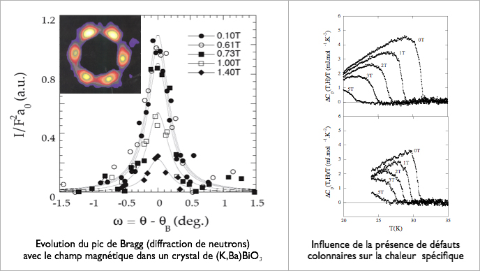 L'état mixte des supraconducteur est une plateforme idéale pour étudier l'influence du désordre sur la structures des systèmes élastiques. Une analyse détaillée des mesures de diffraction de neutrons nous a alors permis d'amener la première preuve expérimentale de l'existence d'un nouvel état de la matière ni totalement ordonnée ni complètement désordonnée : le verre de Bragg (voir Nature 413, 404 (2001)). De plus, en augmentant la température (notamment dans les oxydes à haute Tc), il est possible de faire fondre le solide de vortex. Il est alors très difficile de différencier ce liquide d'une phase normale soumises à des fluctuations ; la défnition du champ critique supérieur devient donc délicate et la détermination expérimentale de ce champ (s'il existe encore) quasiment impossible. Dans ce contexte, le système (K, Ba)BiO3, s'est avéré être un composé particulièrement intéressant puisque les fluctuations y sont trop faibles pour faire fondre le solide de vortex (Tc ~ 32K) mais néanmoins assez fortes pour modifier la transition entre la phase supraconductrice et l'état normal.