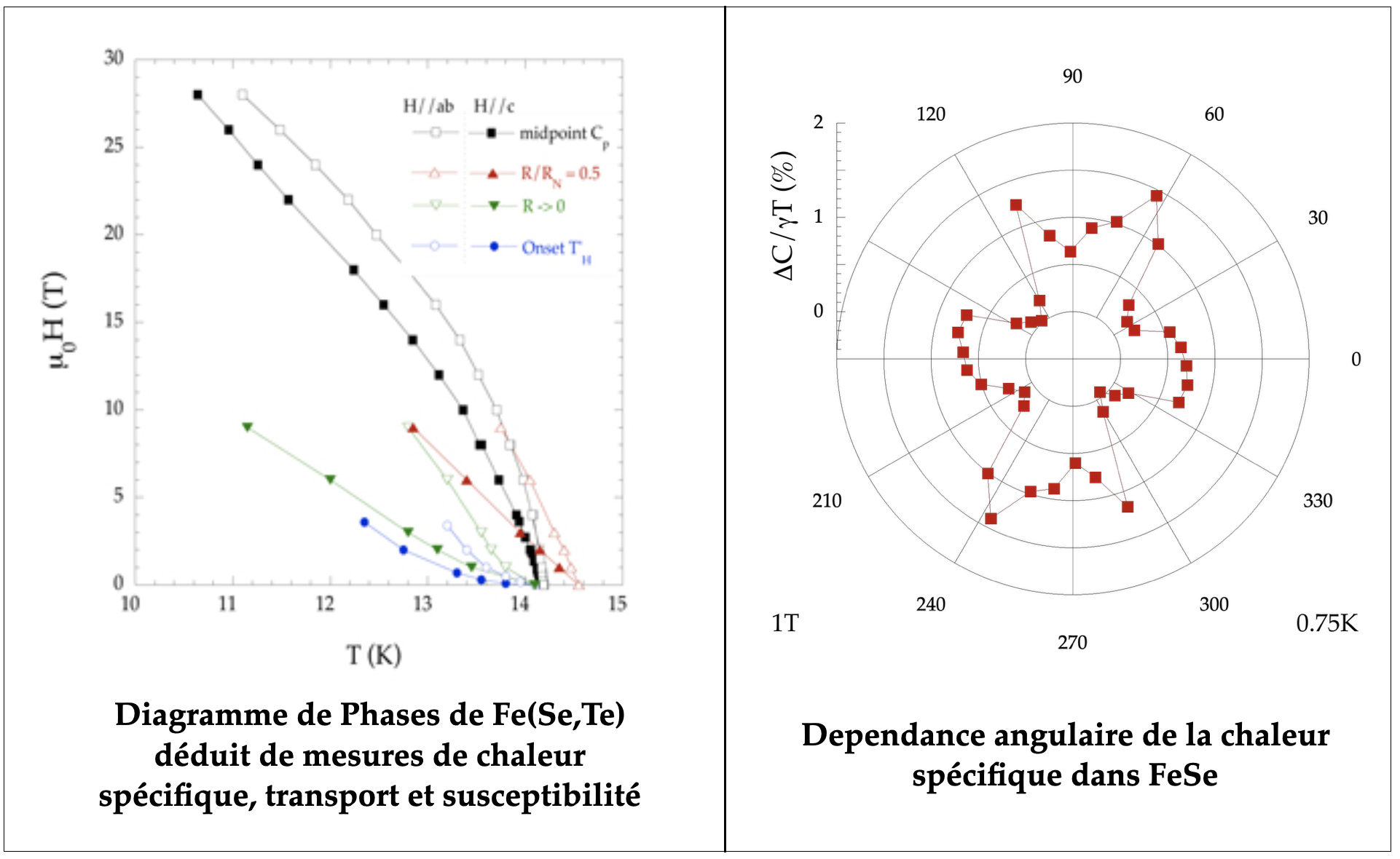 Le composé le plus simple, FeSe, est également le plus énigmatique. Sa densité électronique est extrêmement faible faisant de lui un supraconducteur à "très haute" température critique (bien que sa Tc ne soit que de l'ordre de 9K) à la frontière d'une condensation de Bose Einstein. Ce composé présente également un caractère nématique important mettant en évidence des effets orbitaux extrêmement forts dans la symétrie du gap (Physical Review B 100, 104516 (2019)). Nous avons également montré, qu'à basses températures, le fluage des vortex est d'origine quantique dans Fe(Se,Te) (voir Physical Review B, 89, 014514 (2014) et notre "fait marquant" de l'Institut Néel (#8, 2014)). Enfin, nous avons effectué une étude détaillée du diagramme H-T de FeSe en collaboration avec l'Université de Karlsruhe (voir Physical Review Research 2, 033319 (2020) et Physical Review B, 107, 224506 (2023)) et put faire une analyse détaillée de la symétrie des gaps en étudiant la dépendance angulaire de la chaleur spécifique. En effet, l'effet Doppler associé aux supercourants entourant les coeurs des vortex (en présence d'un champ magnétique dans le plan ab) est un outil particulièrement pertinent pour cette étude mais requiert une technique expérimentale de très haute résolution.