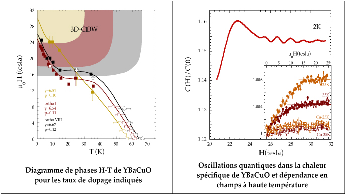 La compétiton entre supraconductivité et ordre de charge est également un sujet d'étude très actif (pour plus de renseignements sur les dichalcogénures, voir par exemple : Physical Review B, 82, 014518 (2010) et Physical Review B, 84, 054531 (2011)). La découverte d'une reconstruction majeure de la surface de Fermi dans YBaCuO sous dopé a relancé l'intérêt de la communauté sur ces composés. La richesse des propriétés de ces composés semble être inéluctablement liée à la complexité de leur diagramme de phases et nous avons débuté une étude détaillée de l'influence du champ magnétique sur ce diagramme sur ce diagramme par chaleur spécifique et aimantation locale.