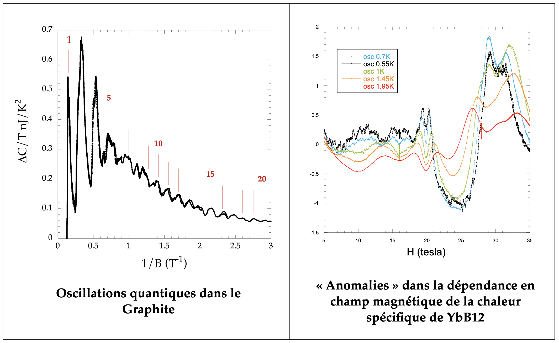 La compréhension des propriétés remarquables des solides passent généralement par l'étude de leur structure électronique et notamment de la topologie de leur surface de Fermi. Les oscillations quantiques constituent alors un outil particulièrement intéressant pour en déterminer la taille ou la masse effective. L'outil que nous avons développé nous permet désormais d'étudier ces oscillations par le biais d'une sonde thermodynamique : la chaleur spécifique.