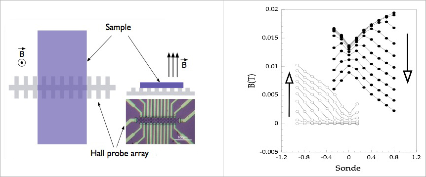 A titre d'exemple la figure de droite présente l'évolution de l'induction magnétique dans un film mince de Nb (supraconducteur de type II) pour des champs extérieurs croissants (mesurés sur la partie gauche de l'échantillon, symboles creux) puis décroissants à partir à 0.2T (mesurés sur la partie droite de l'échantillon, symboles pleins). Le piégeage des vortex y est clairement visible.
