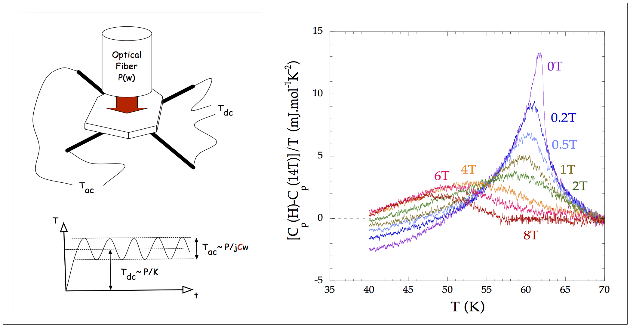 Cette technique est aujourd'hui au coeur de notre activité. elle a été développée en très étroite collabortation avec Christophe Marcenat (CEA-Grenoble). Initiallement, la technique de modulation que nous avons développée consistait à chauffer l'échantillon à l'aide d'une diode reliée à une fibre optique (chauffage AC de puissance P et fréquence ω). L'échantillon était alors directement monté sur deux thermocouples qui servaient à la fois de porte échantillon, de fuite thermique (K) et de capteurs de température (voir schéma ci-dessus). Le premier thermocouple permet ici de déterminer l'échauffement moyen (P/K) et le second les oscillations de température de l'ordre de P/jCω où C est la chaleur spécifique. Particulièrement bien adaptée à la mesure de petits échantillons (de 5 à 0.005 mg), cette technique permet de déterminer C avec une résolution ∼ 0.1pJ/K (à 2K) et une sensibilitè ∼ 1/1000.