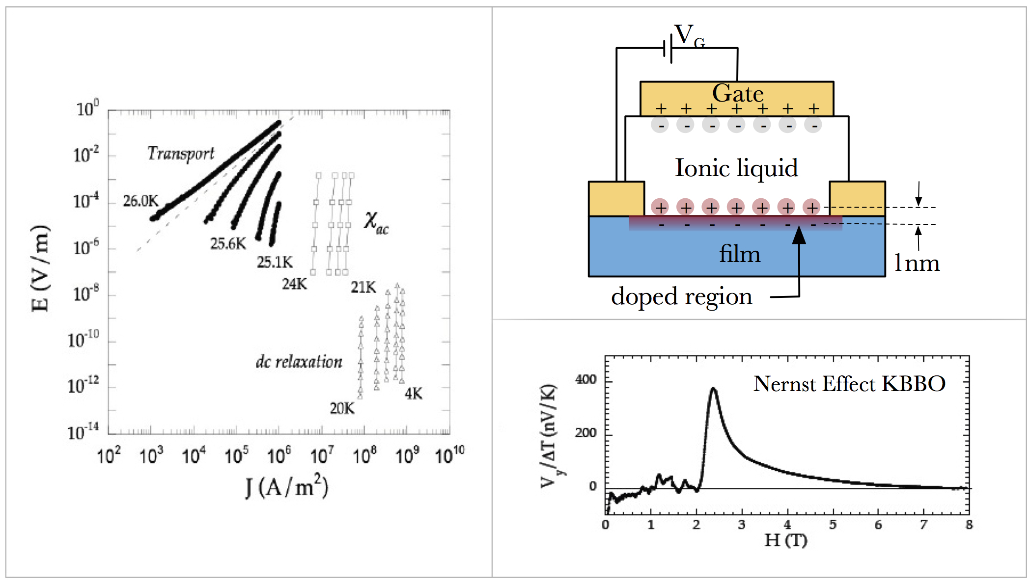 Il est également possible de mesurer l'évolution sous champ de la tension transverse induite soit par un courant (effet Hall) soit par un gradiant thermique (effet Nernst (à titre d'exemple la courbe ci-dessus présente l'effet Nernst mesuré à 24K dans (K,Ba)Bi03). Enfin, nous développons actuellement des mesures de transport sous dopage par effets de champ à l'aide de liquides ioniques (voir schéma ci-dessus) en étroite collaboration avec Shimpei ONO du CRIEPI (Tokyo).